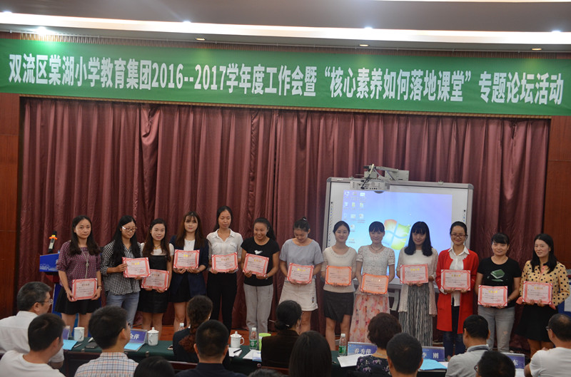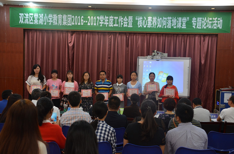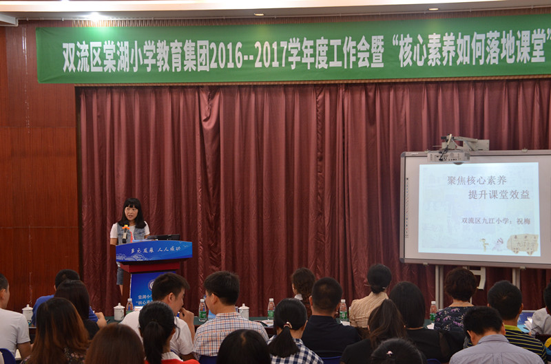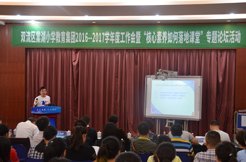 2016年9月30日,告别九月,风吟唱着秋日的恋歌,轻轻划过树梢。这一天,在棠湖小学合唱排练厅里,最后一朵秋日的海棠花,带着阳光的嘱托,绽放在了棠湖小学教育集团关于“核心素养如何落地课堂”的专题活动现场。本次与会人员有各小课题研学会学员、各集团校教导处主任以及分管教学副校长。一群特别的来宾也莅临了本次专题活动,他们是教育局小教科科长罗丽、研培中心主任邱刚田、副主任谢祖福、九江小学乔秀平校长、黄甲小学穆占文校长、公兴小学李刚校长、棠湖小学(南区)王云章校长、青白江玉虹小学王志东校长。此次的相聚,承前继后。即是对集团启动以来三年发展计划成果的阶段梳理,同时也以“核心素养落地”为抓手,对未来三年集团这个研学共同体更为实效、实在的运做指明了行进的方向。会议在棠湖小学李顺榕校长的致词中拉开了华丽的序幕。